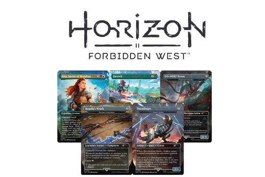 Colecție exclusivă Secret Lair inspirată de universul post-apocaliptic Horizon! Acest set special aduce eroina Aloy și mașinile mecanice iconice în lumea Magic: The Gathering, cu ilustrații unice dedicate aventurii epice din Forbidden West.